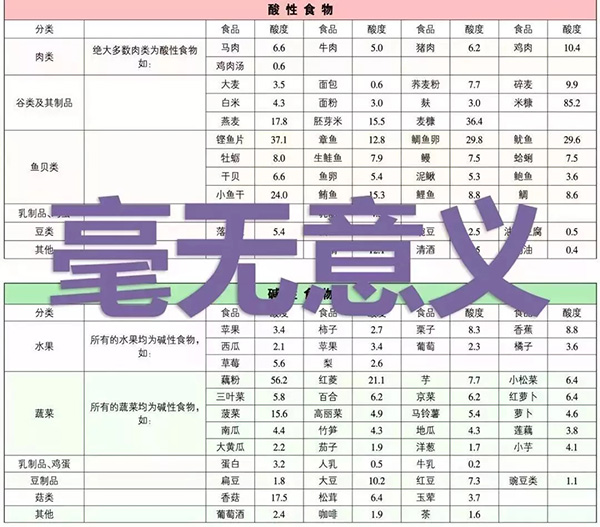 至于网络上类似下面这种,煞有介事整理出的酸碱食物表,真的是……