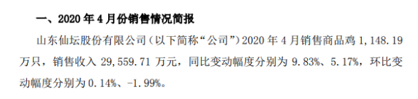 挖贝网 5月10日消息,仙坛股份(证券代码:002746)发布公告称,公司2020年4月销售商品鸡1,148.19万只,销售收入29,559.71万元,同比变动幅度分别为9.83%、5.17%,环比变动幅度分别为0.14%、-1.99%。