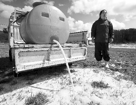 3月27日,在福岛县的二本松市,无奈的奶农倾倒放射性物质超标的牛奶。新华社发