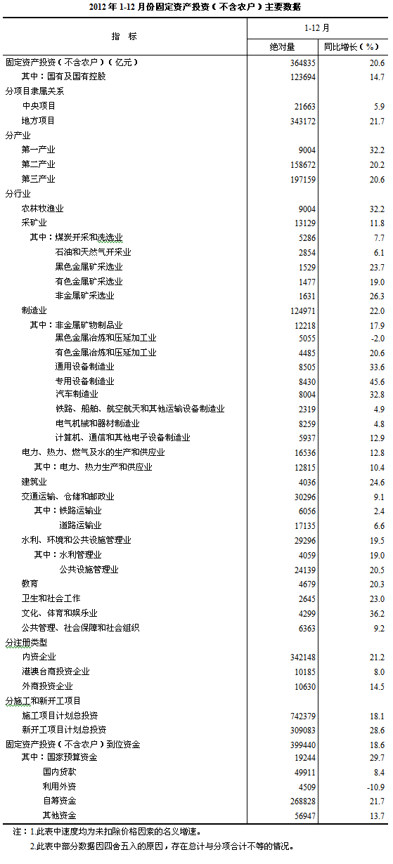 来自国家统计局官方网站信息,2012年1-12月份,全国固定资产投资(不含农户)364835亿元,同比名义增长20.6%(扣除价格因素实际增长19.3%),增速比1-11月份回落0.1个百分点,比2011年回落3.4个百分点。从环比看,12月份固定资产投资(不含农户)增长1.53%。