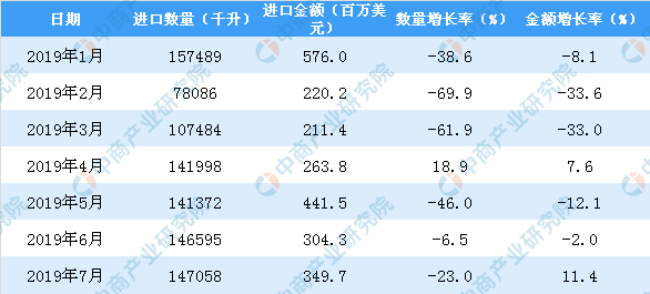 据中商产业研究院数据库显示,2019年1-2季度中国酒类进口量明显增长,增长25.33%。2019年1-7月中国酒类进口量为919907千升,同比下降39.8%。