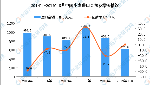 据中商产业研究院数据库显示,2019年1-2季度中国小麦进口量有所下降,2019年1-8月中国小麦进口量为210万吨,同比下降5.3%。