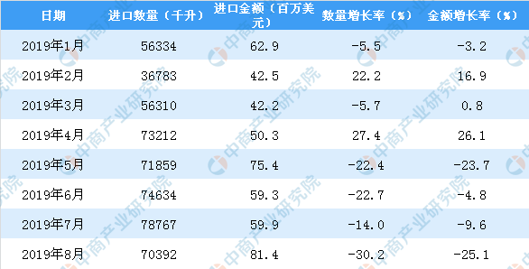 据中商产业研究院数据库显示,2019年1-2季度中国啤酒进口量逐渐增长,增长47.03%。2019年1-8月中国啤酒进口量为518252千升,同比下降11.9%。