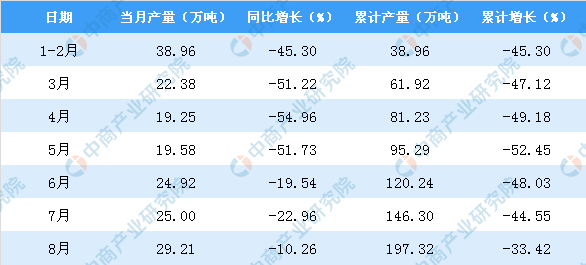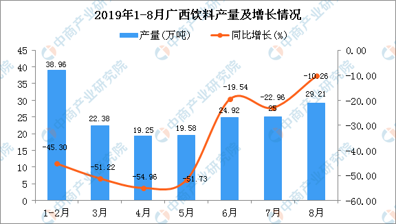 据中商产业研究院数据库显示,2019年1-2季度广西饮料产量有小幅度增长,2019年8月广西饮料产量为29.21万吨,同比下降10.26%。2019年1-8月广西饮料产量为197.32万吨,同比下降33.42%。