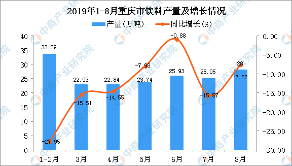 据中商产业研究院数据库显示,2019年1-2季度重庆市饮料产量逐渐增长,2019年8月重庆市饮料产量为28万吨,同比下降7.62%。2019年1-8月重庆市饮料产量为187.72万吨,同比下降11.63%。