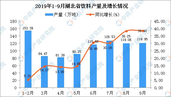 据中商产业研究院数据库显示,2019年1-3季度湖北省饮料产量逐渐增长,2019年9月湖北省饮料产量为119.95万吨,同比增长38.4%。2019年1-3季度湖北省饮料产量为994.64万吨,同比增长36.56%。