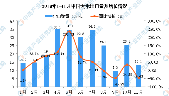 据中商产业研究院数据库显示,2019年1-2季度中国大米出口量明显增长,增长107.1%。2019年3季度中国大米出口量有小幅度下降,2019年11月中国大米出口量为13.1万吨,同比下降47.4%。