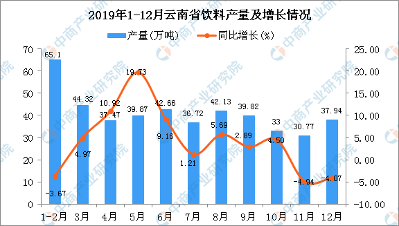 据中商产业研究院数据库显示,2019年1-4季度云南省饮料产量波动幅度较小,2019年12月云南省饮料产量为37.94万吨,同比下降4.07%。2019年云南省饮料产量为451.6万吨,同比增长3.98%。