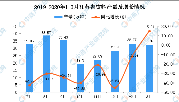 据中商产业研究院数据库显示,2020年3月江苏省饮料产量为31.97万吨,同比增长15.04%。2020年1季度江苏省饮料产量为64.74万吨,同比下降0.23%。