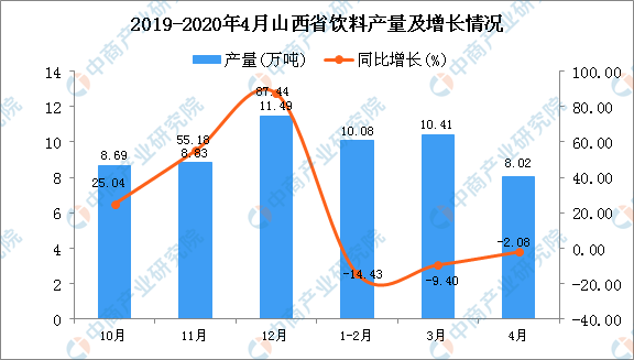 据中商产业研究院数据库显示,2020年4月山西省饮料产量为8.02万吨,同比下降2.08%。2020年1-4月山西省饮料产量为28.58万吨,同比下降9.7%。