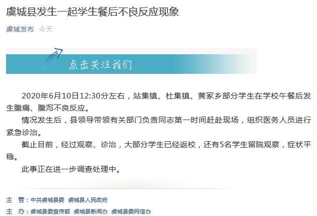 据河南虞城县委宣传部官方微信消息,6月10日12时30分左右,虞城县站集镇、杜集镇、黄冢乡部分学生在学校午餐后发生腹痛、腹泻不良反应。