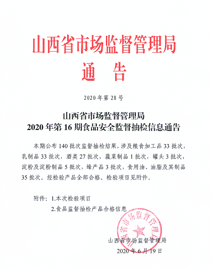 山西省市场监督管理局发布2020年第16期食品安全监督抽检信息通告,全部合格。