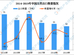 据中商产业研究院数据库显示,2016-2019年中国豆类出口量呈小幅度下降,2019年1-12月中国豆类出口量为50万吨,同比下降9.9%。