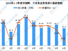 据中商产业研究院数据库显示,2016-2018年中国鲜、干水果及坚果进口量有所增长,2019年1-3季度中国鲜、干水果及坚果进口量为576万吨,同比增长32.7%。