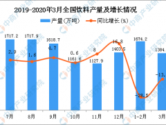 据中商产业研究院数据库显示,2020年1季度全国饮料产量有所下降,2020年3月全国饮料产量为1384.2万吨,同比下降13.3%。2020年1季度全国饮料产量为3086.1万吨…